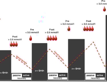 The local lactate test involves 3 sub max efforts of greater than 6 mins each with adequate recovery inbetween and a final all out effort of 3 to 4 minutes